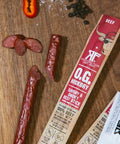 Behold, Righteous Felon's classic, smoky and savory 100% beef, original hickory meat stick with hints of garlic, onion, cracked pepper, a garnish of sea salt, and that crisp snap that takes you back to your favorite childhood meat snack. Slim better watch his back, RF's new beef stick now runs this block. - Savory and savory, original recipe beef stick - 100% beef - 9g protein - No antibiotics or added hormones - No added nitrates or nitrites - Gluten free - Soy free - Paleo friendly (just 1g sugar)