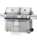 - The Stainless Steel Prestige® PRO 825RSIB Gas Grill features 4 main burners, rear infrared rotisserie burner and integrated smoker burner under the main grill head, two infrared sear station burners and a warming burner under the secondary hood, has 123,000 total BTU's, and space enough to grill up to 51 hamburgers
